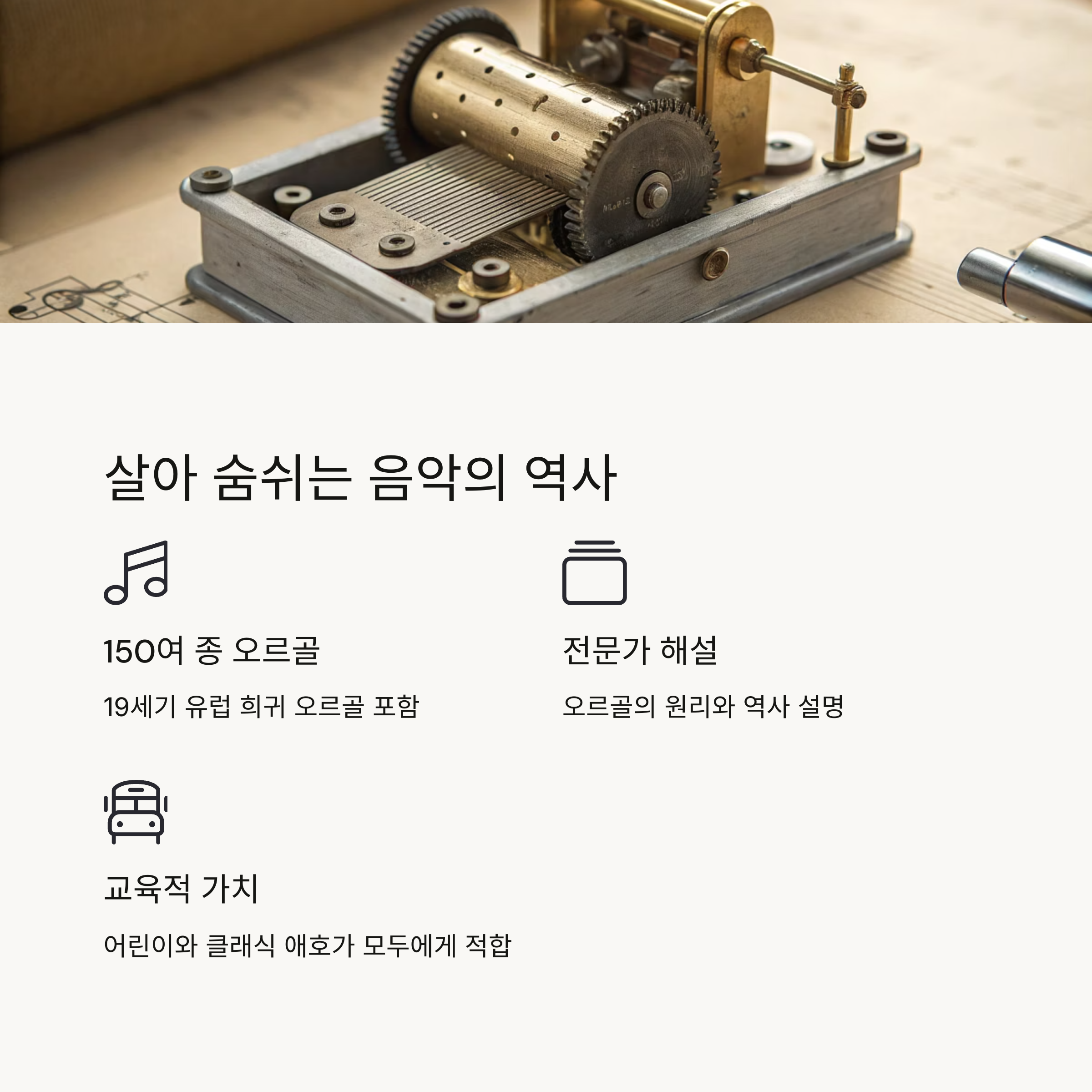 오르골의 원리와 제작 역사, 연주 방식 등을 전문가의 해설과 함께 체험할 수 있어