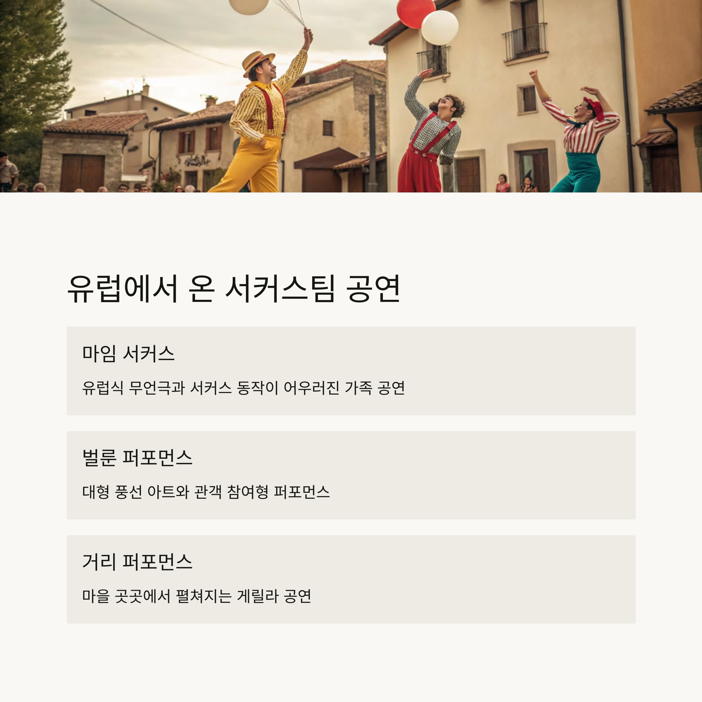 | 마임 서커스 | 무언극 + 서커스 동작이 어우러진 유럽식 가족 공연 |