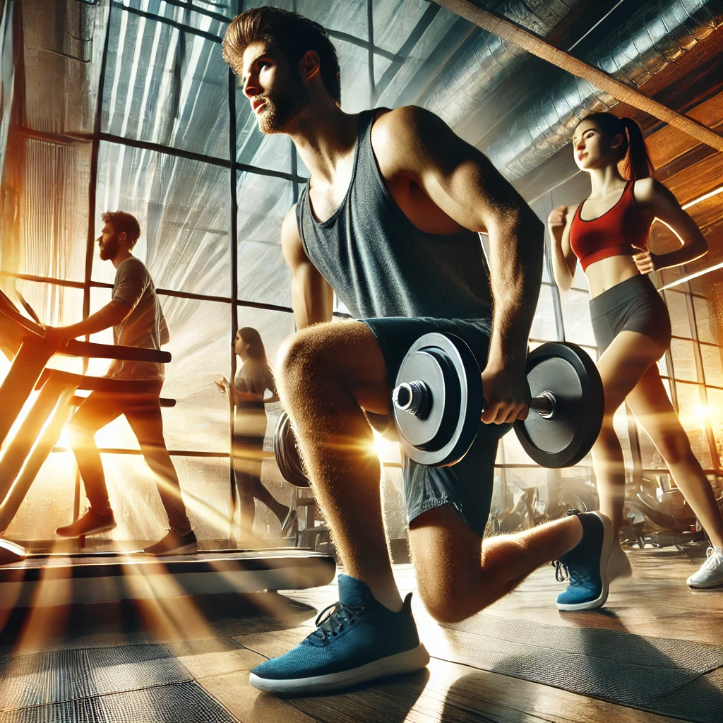 여기 활기찬 분위기의 운동 사진입니다! 헬스장에서 사람들이 열심히 운동하는 모습이 담겨 있으며, 웨이트 트레이닝, 러닝, 요가 등의 다양한 운동이 포함되어 있어요. 자연광이 들어오는 현대적인 공간에서 운동하는 모습이 매우 역동적이고 의욕적인 느낌을 줍니다.