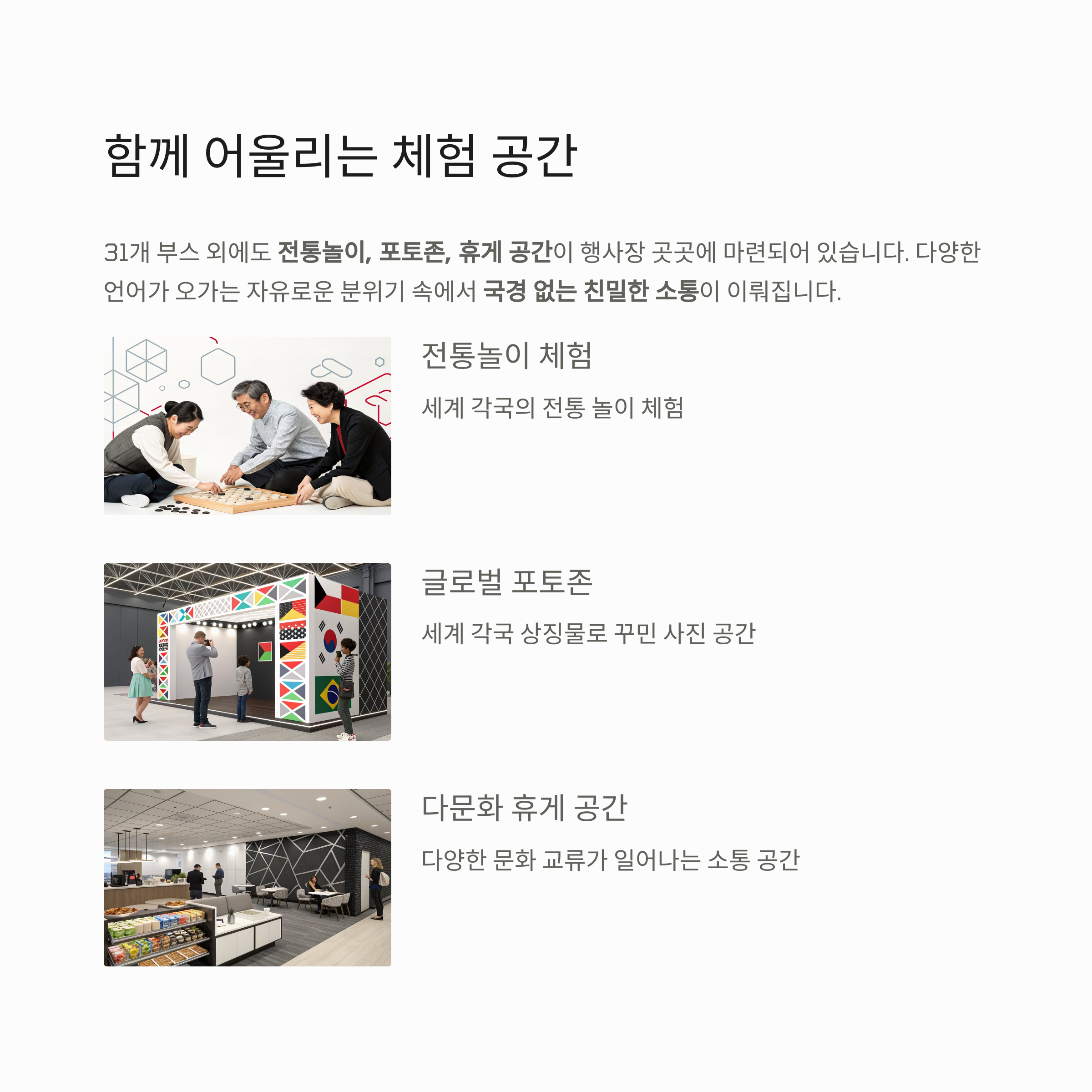 다양한 국가의 전통의상, 음식, 공예품, 악기 등을 직접 체험할 수 있는 부스가 운영됩니다.