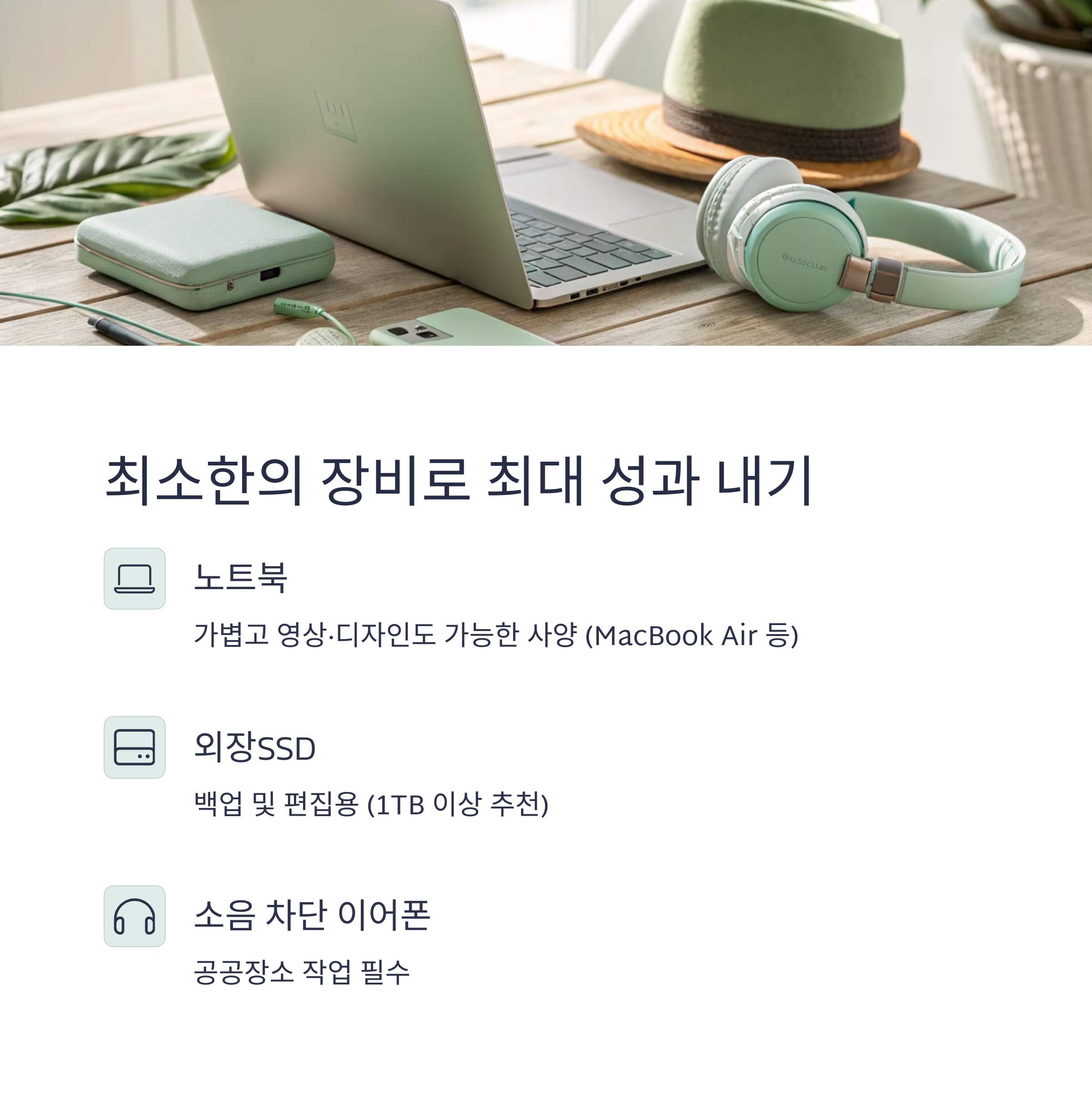 | 외장SSD | 백업 및 편집용 (1TB 이상 추천) |