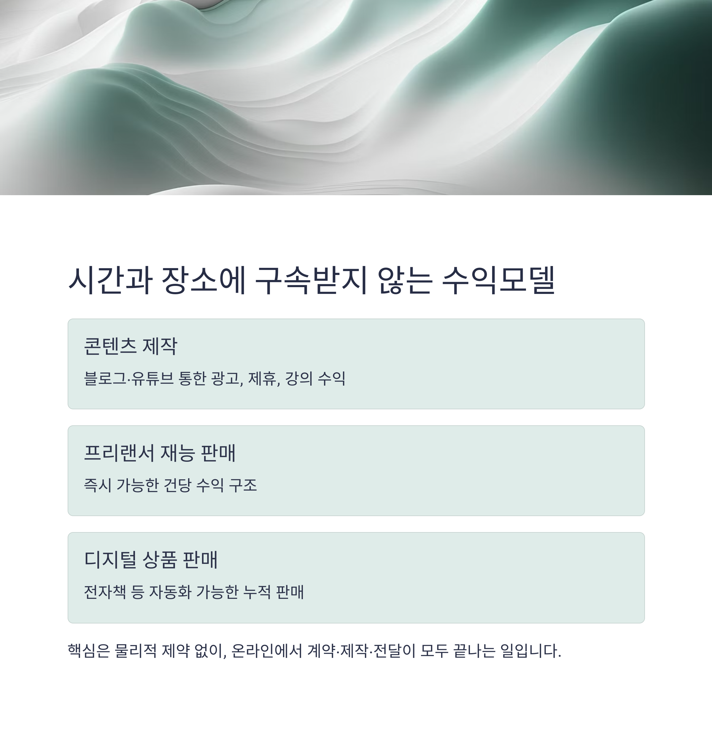 즉, 배송·재고·직접 대면이 없는 비물리적 모델이 적합합니다.