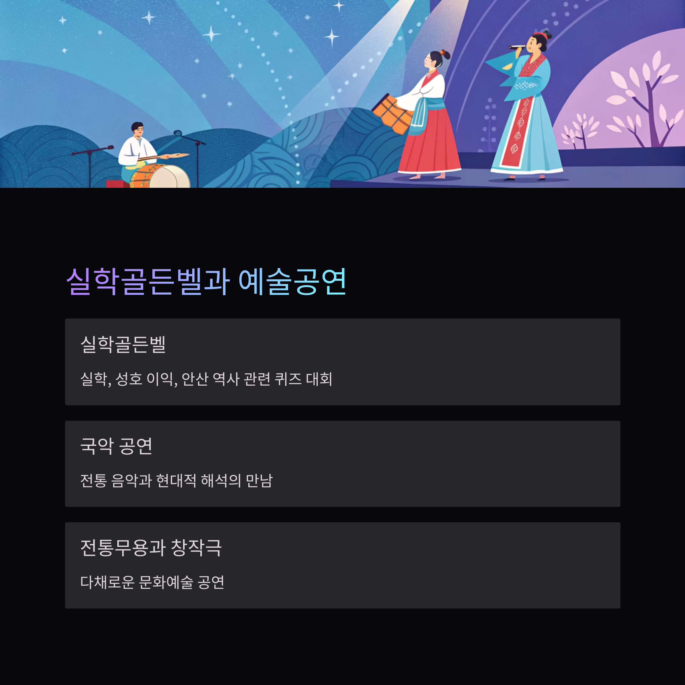 이외에도 국악 공연, 전통무용, 창작극 등 다채로운 문화예술 공연이 축제 분위기를 더합니다.