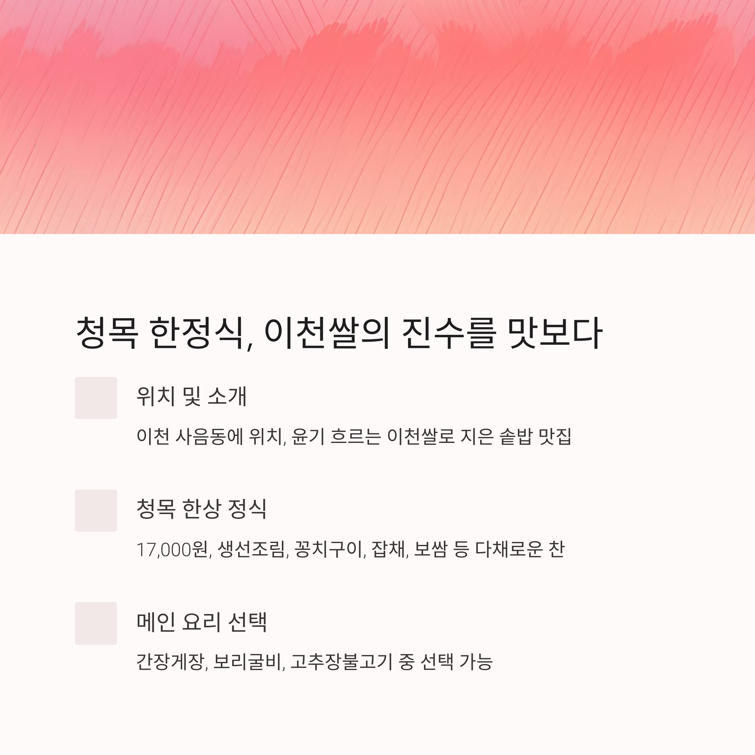 이천 사음동에 위치한 청목 한정식은 윤기 흐르는 이천쌀로 지은 솥밥과