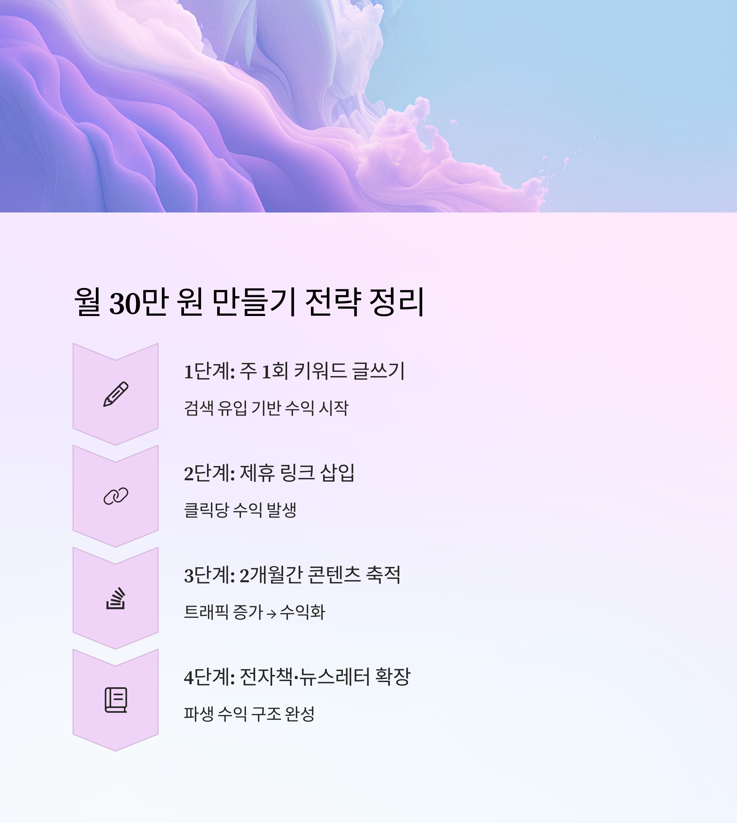 | 1단계 | 주 1회 키워드 글쓰기 | 검색 유입 기반 수익 시작 |