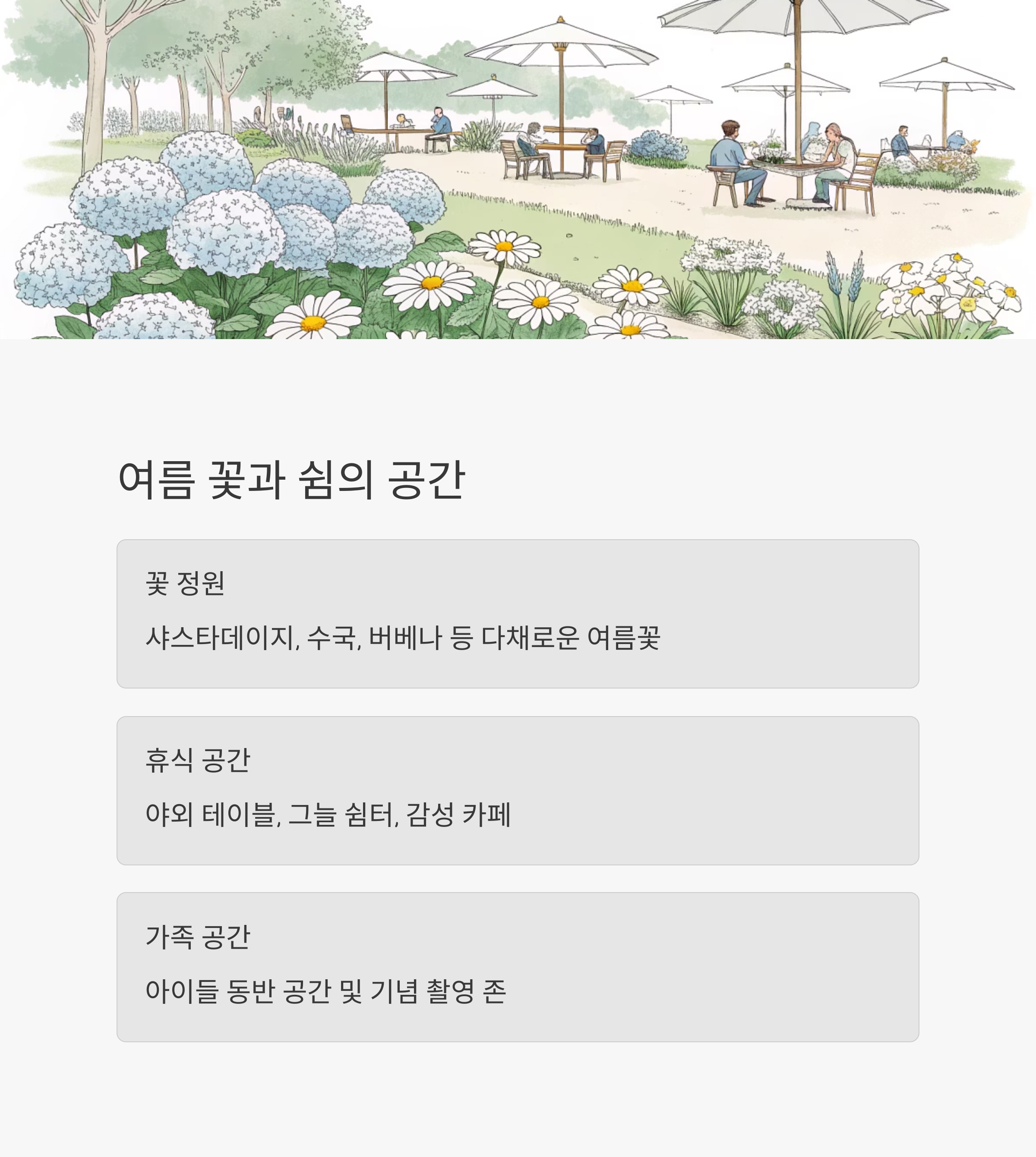 가족이나 연인 단위 관람객을 위한 야외 테이블, 그늘 쉼터, 감성 카페도 마련되어