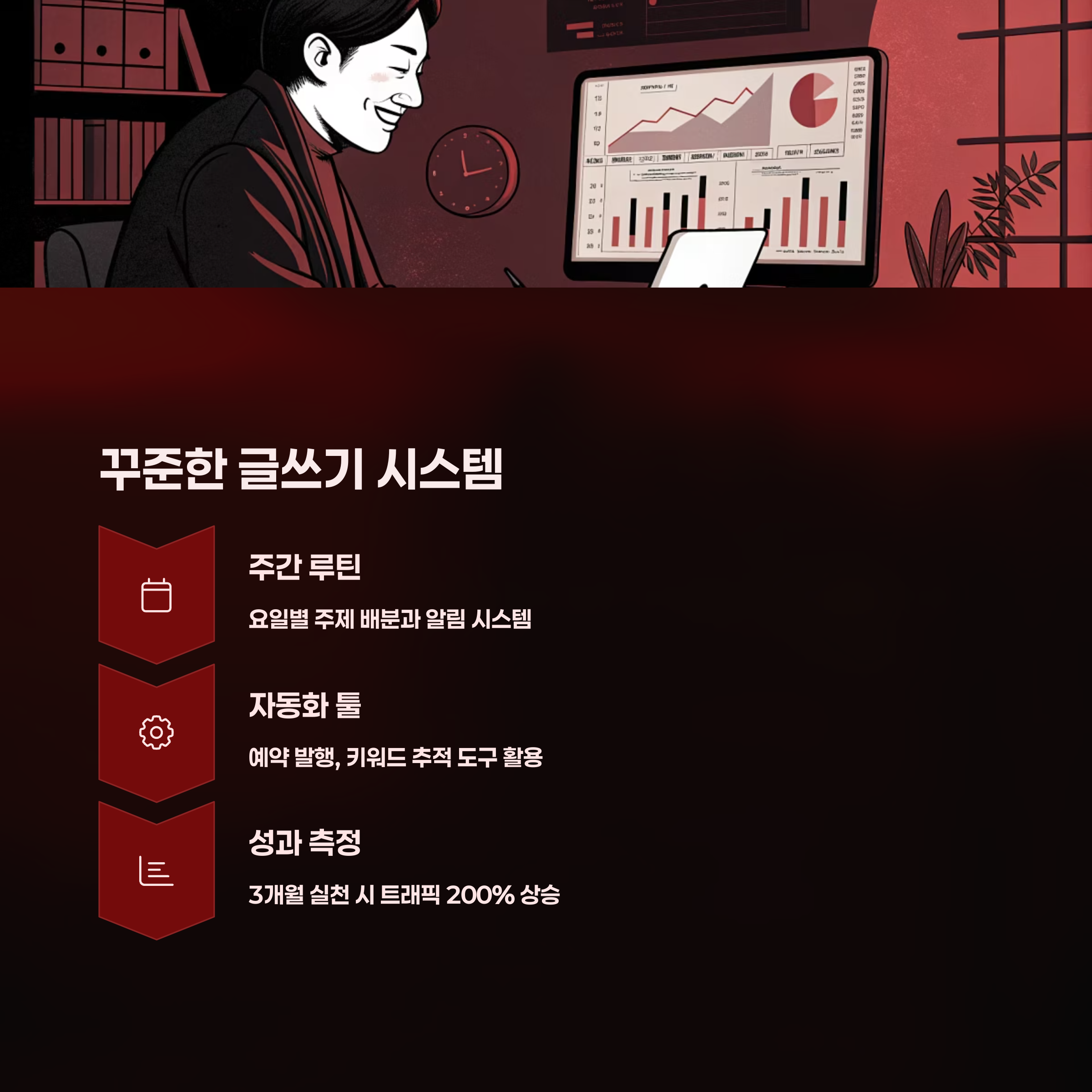 - 글쓰기 루틴 확보 (예: 주 3회 오전 9시 작성)