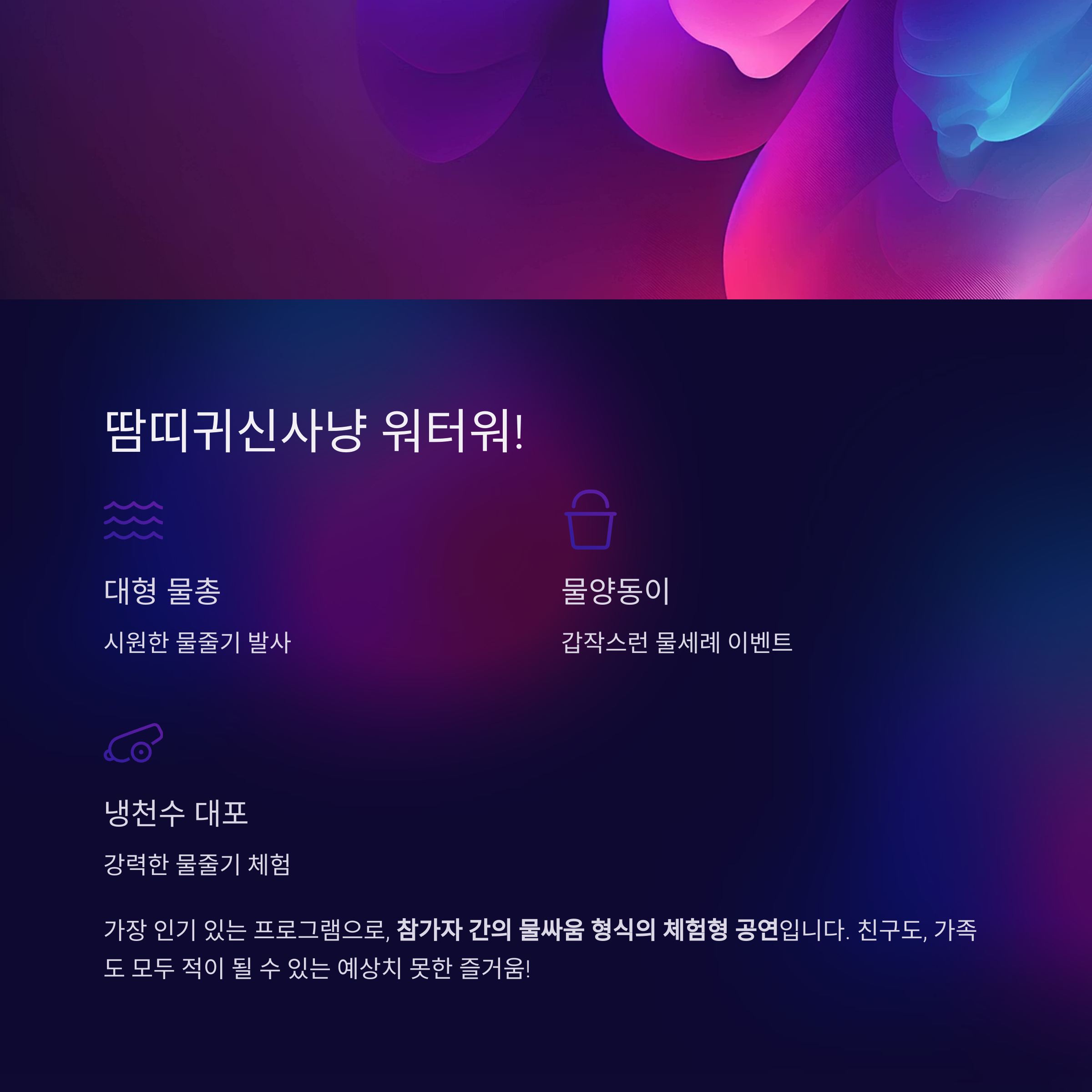 가장 인기 있는 프로그램 중 하나는 ‘땀띠귀신사냥 워터워’입니다.