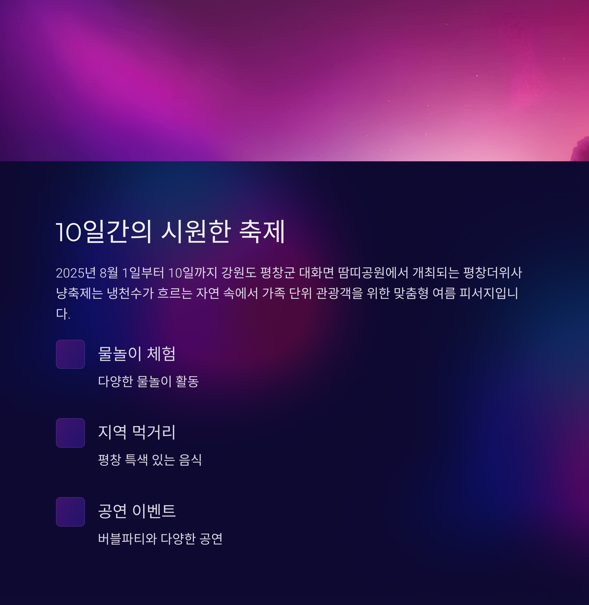 단순한 관광을 넘어 평창의 삶과 문화를 체험할 수 있는 공간으로 구성됩니다.