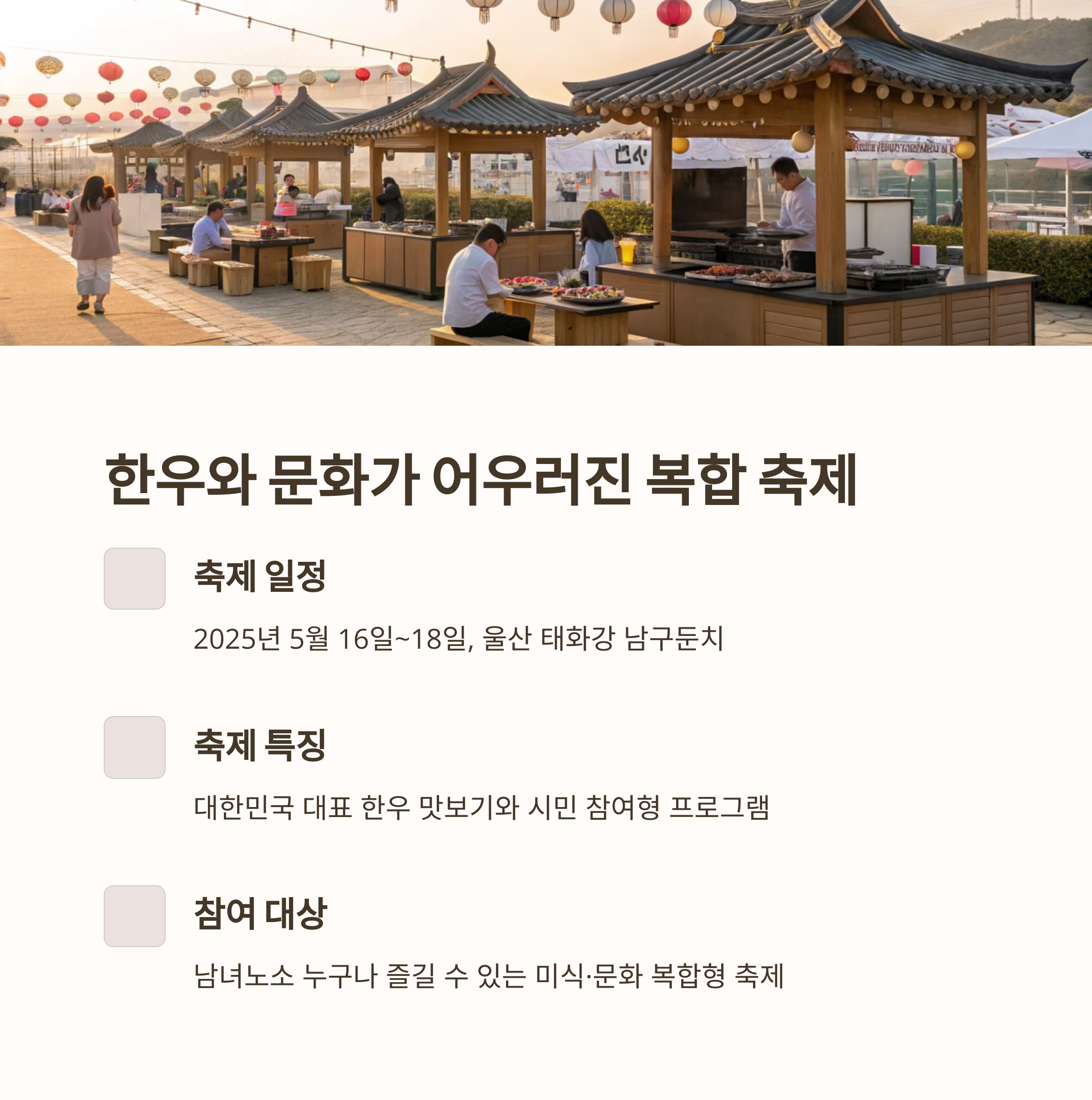 울산 태화강 남구둔치에서는 **대한민국 대표 한우를 맛보고 즐길 수 있는 ‘울산축협 한우축제’**가 열립니다.