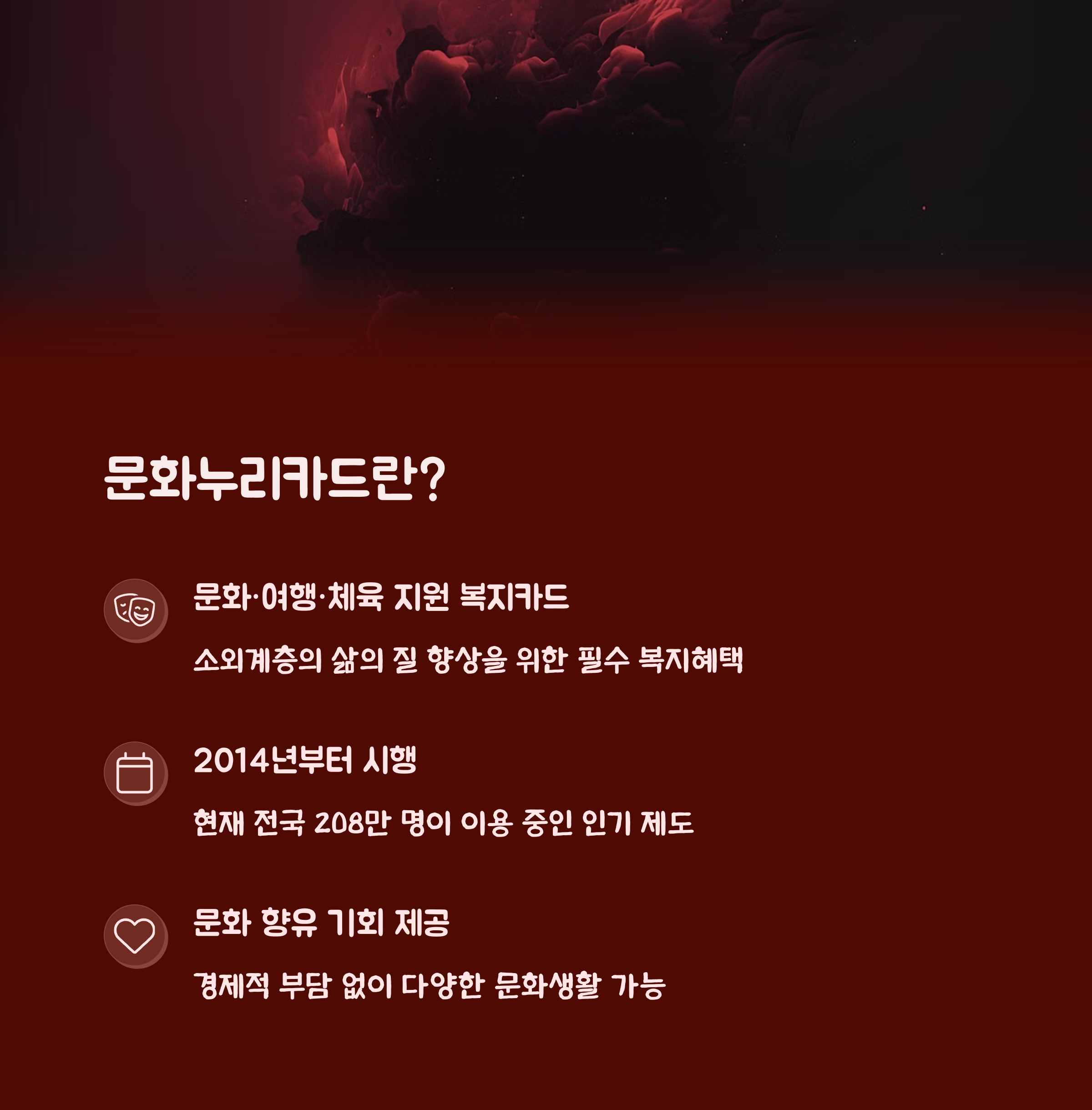 "문화누리카드"는 경제적 여건으로 문화생활을 누리기 어려운 취약계층을 위한 복지카드입니다