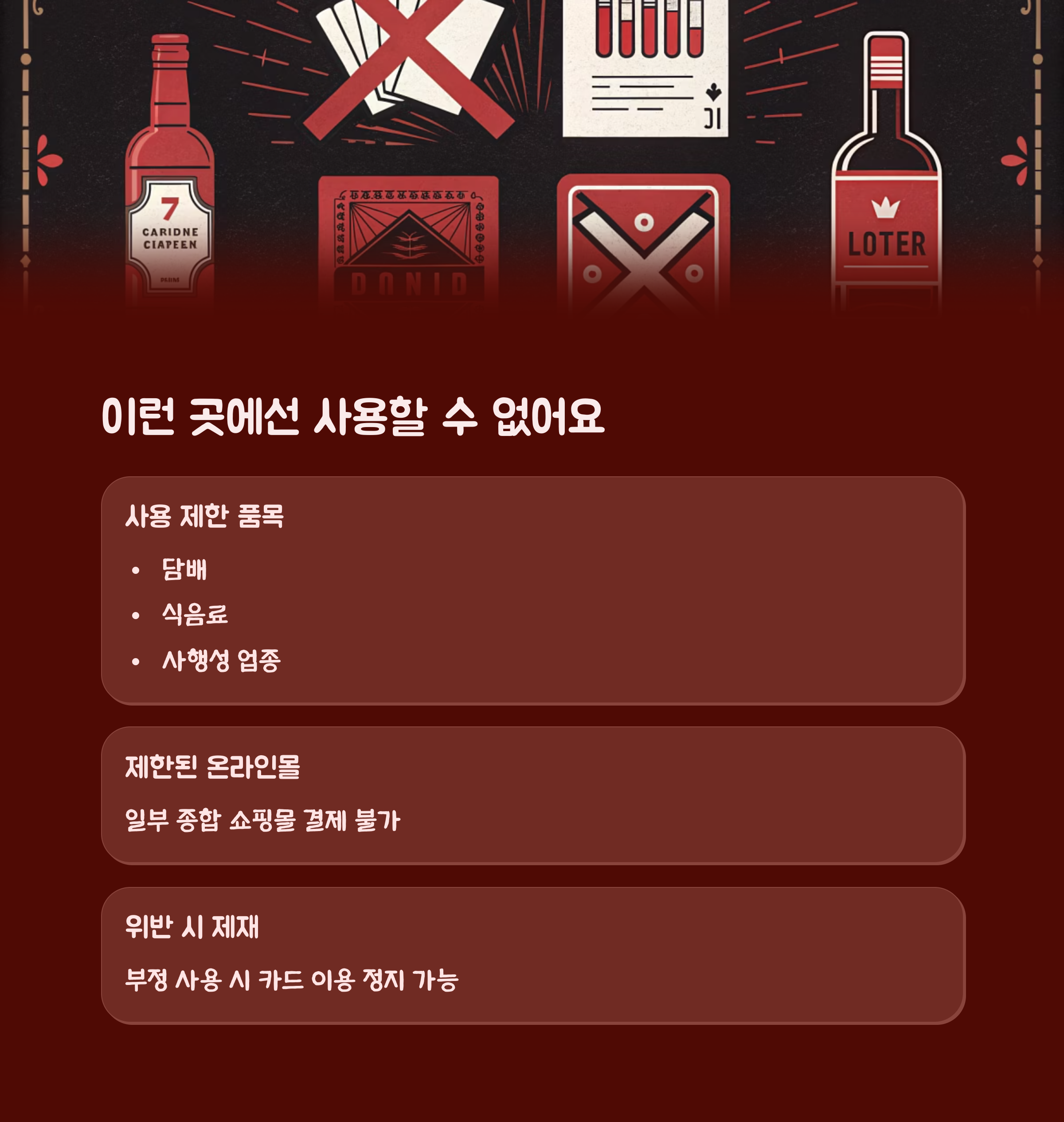 담배, 의류, 식음료, 유흥업소 등에서는 사용이 제한됩니다