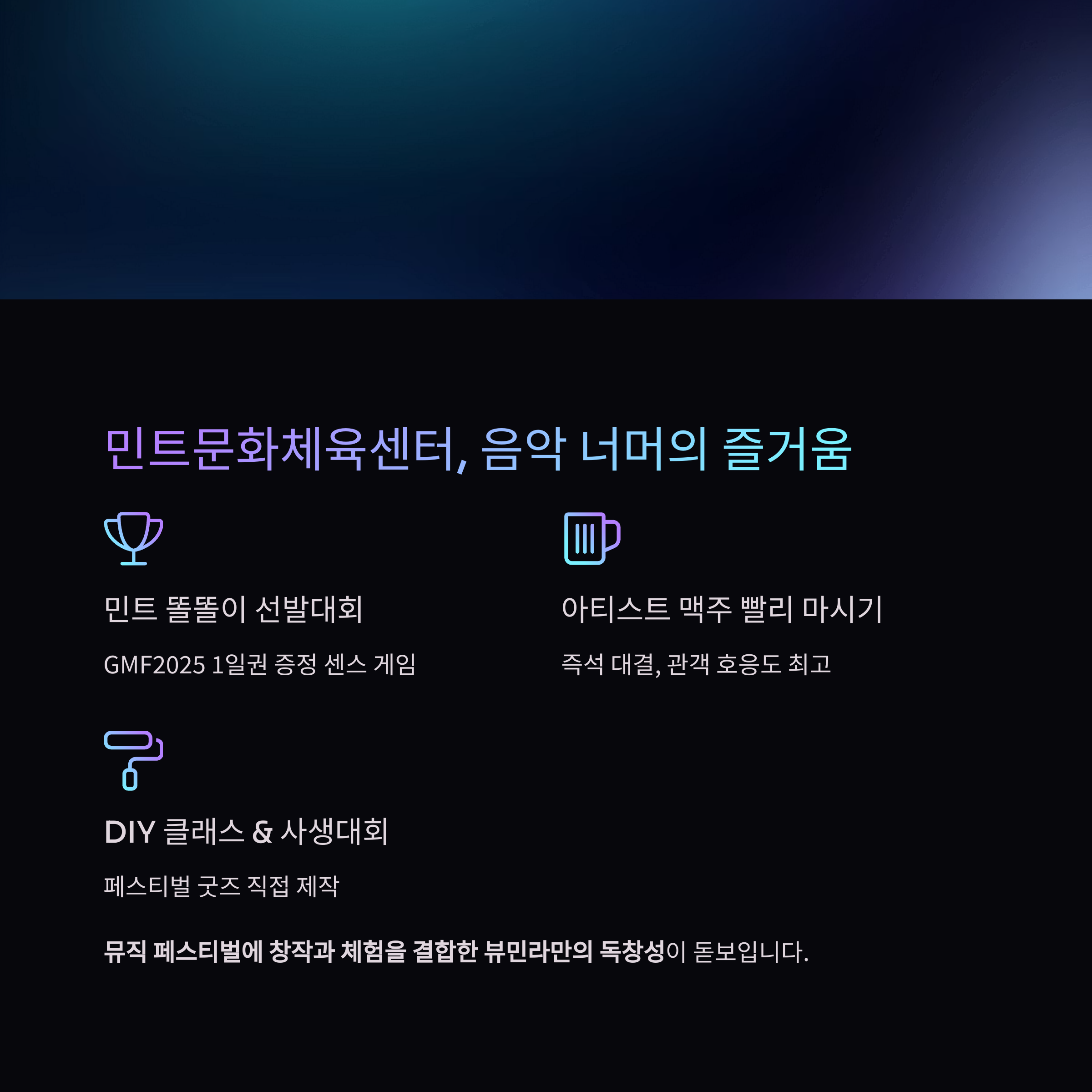 뮤직 페스티벌에 창작과 체험을 결합한 뷰민라만의 독창성이 돋보입니다.