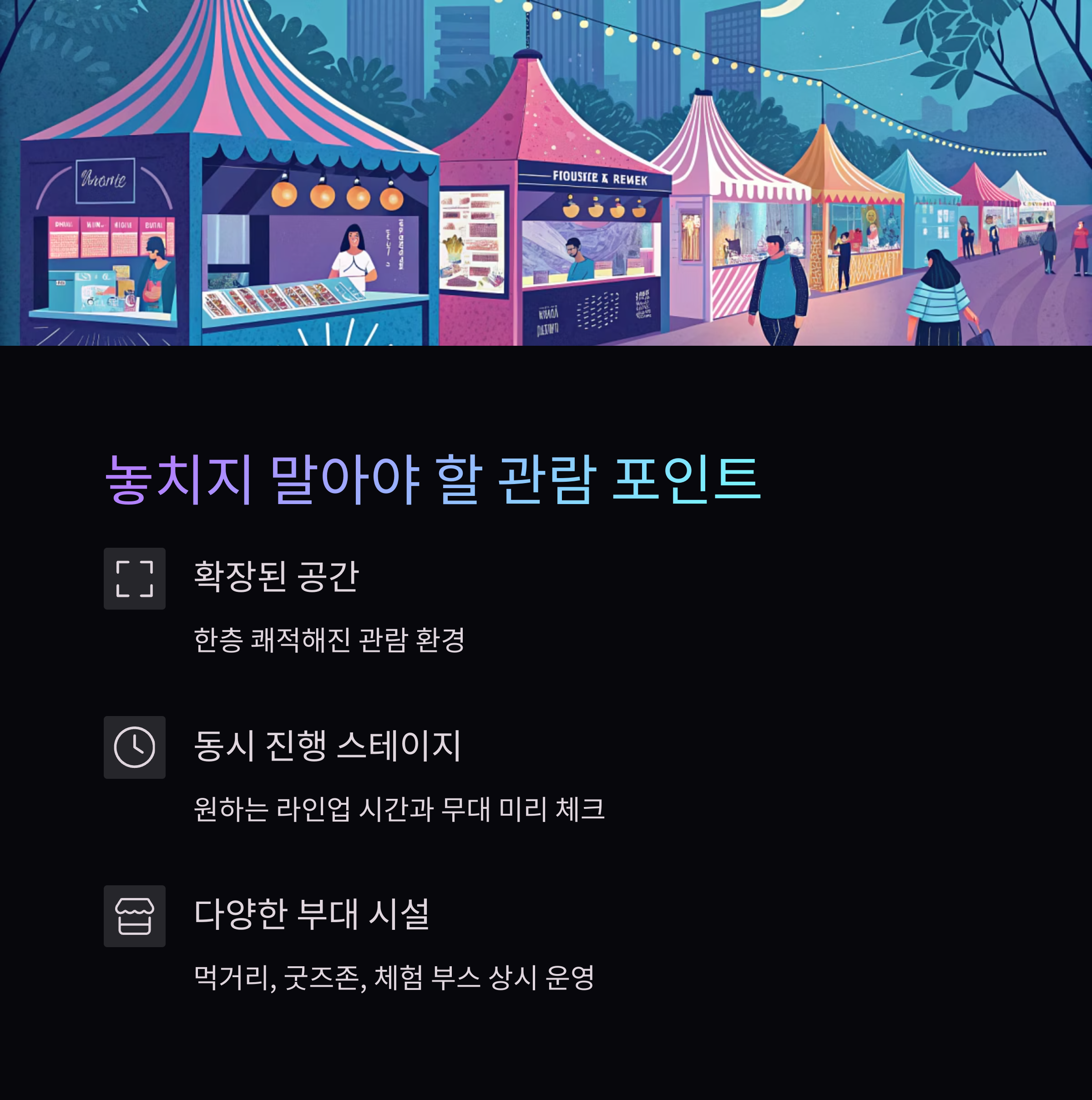 - 먹거리, 굿즈존, 체험 부스 등 다양한 부대 시설도 상시 운영되며