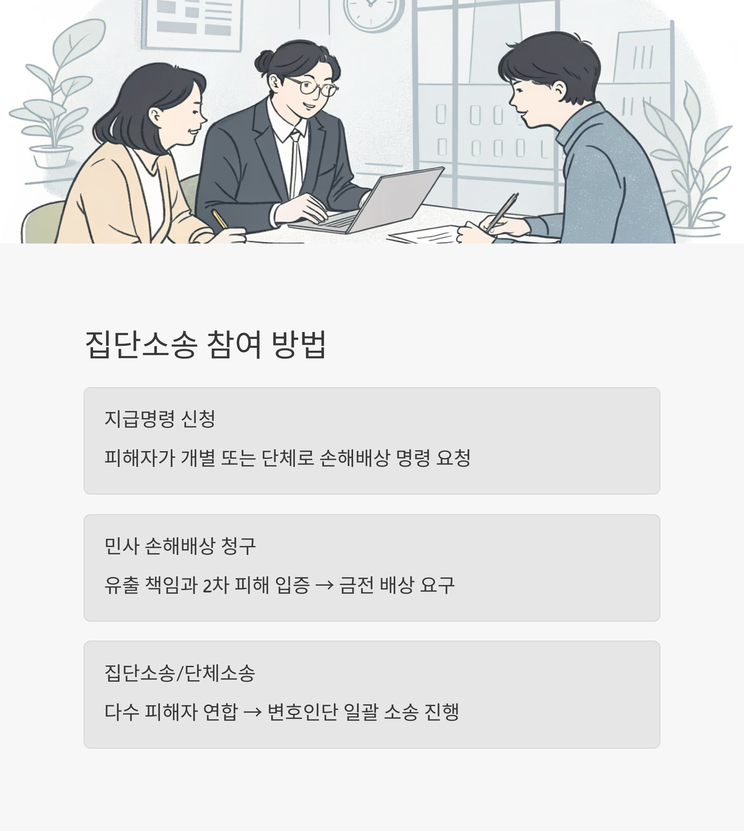 | 집단소송/단체소송 | 다수 피해자 연합 → 변호인단 일괄 소송 진행 |