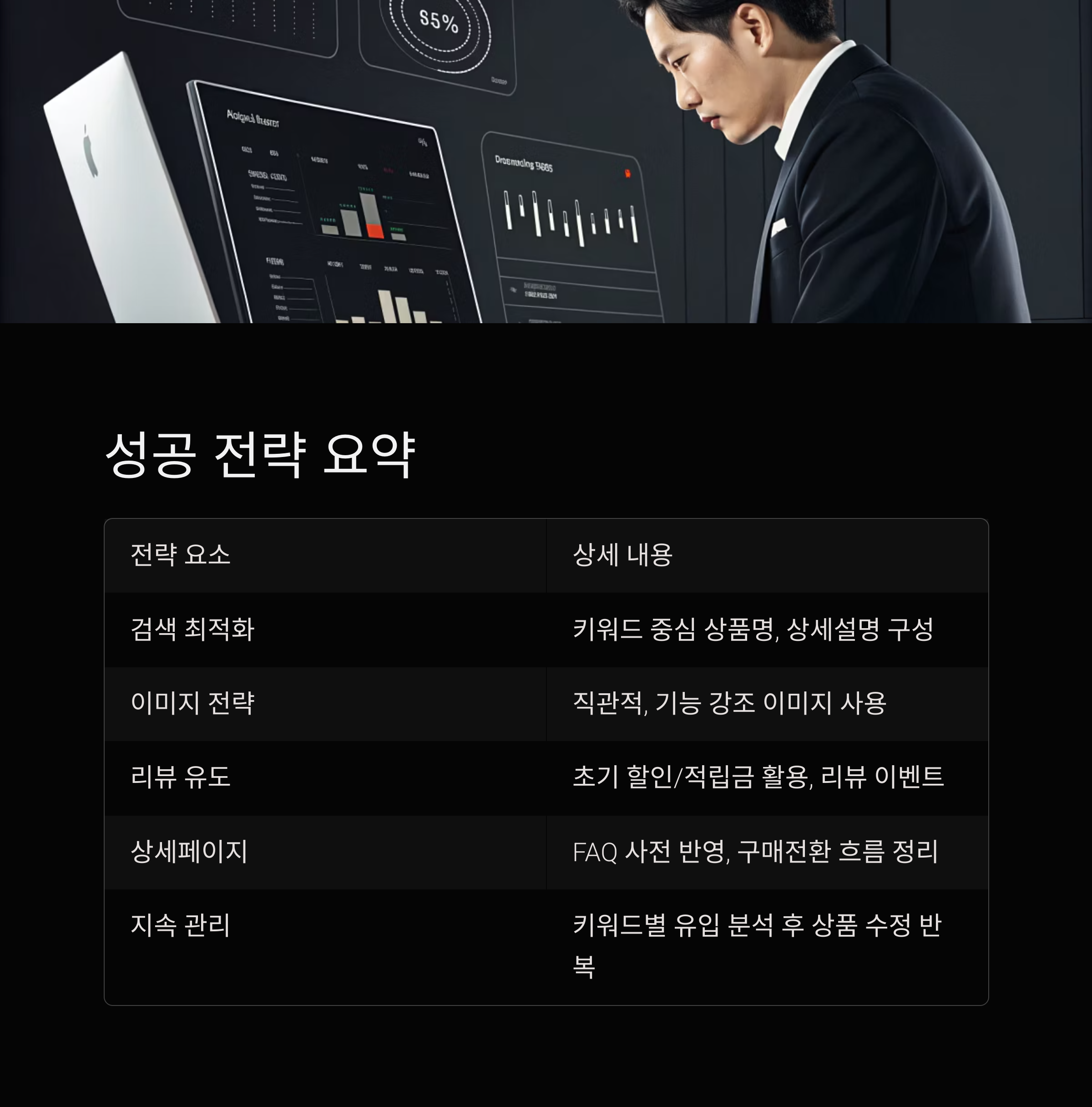 | 지속 관리 | 키워드별 유입 분석 후 상품 수정 반복 |